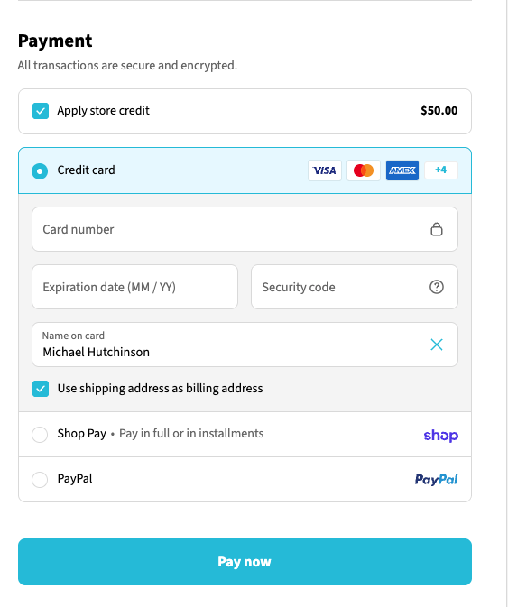 Apply Your Store Credit - You’ll see your available credit displayed at checkout. You can apply it toward your order total. If your credit covers the full order amount, you won’t need to enter another payment method. If your credit does not cover the full total, you can pay the remaining balance using a credit card or another accepted payment method.